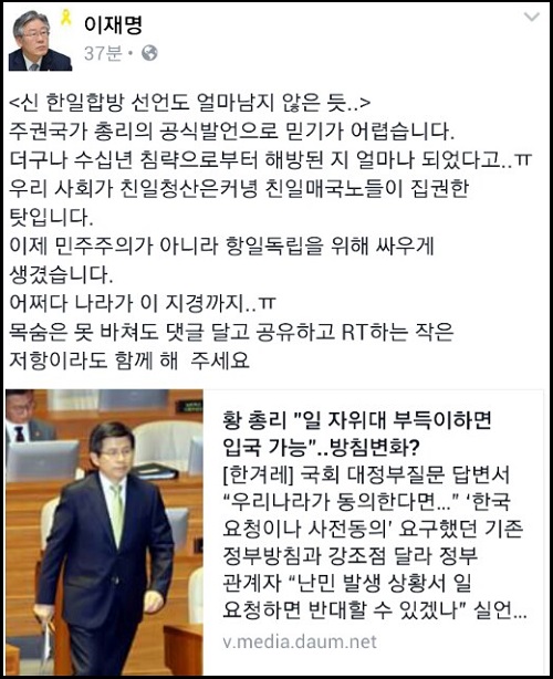 이재명 성남시장도 황 총리의 이 같은 발언을 두고 “신 한일합방 선언도 얼마 남지 않은 듯(하다)”며 우려를 나타냈다.