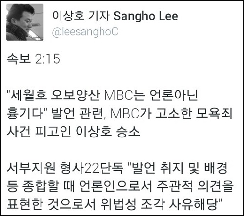 판결 직후, 이상호 기자는 자신의 트위터를 통해 승소 소식을 알렸다.