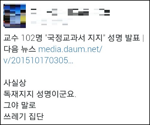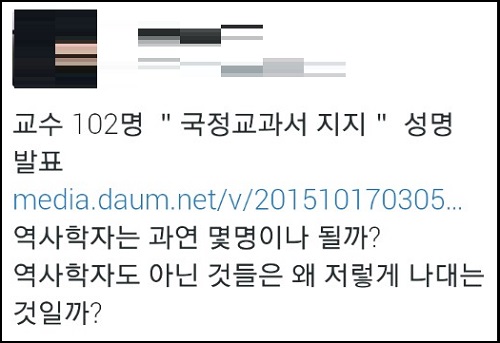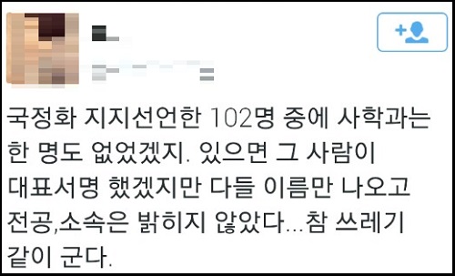 한편, 교수 102명의 성명서에는 이름만 있을 뿐 학교와 전공 등은 빠져있다. 이와 관련 일부 네티즌들은 이들을 향해 ‘국정화 지지가 떳떳하다면 학교와 전공까지 밝히라’며 목소리를 높이기도 했다.