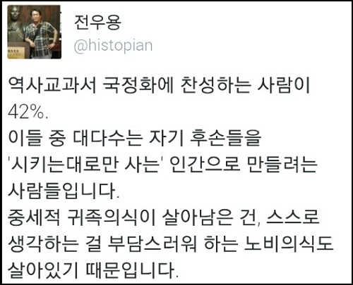 이와 관련 역사학자 전우용 박사는 트위터를 통해 “역사교과서 국정화에 찬성하는 사람이 42%. 이들 중 대다수는 자기 후손들을 ‘시키는대로만 사는’ 인간으로 만들려는 사람들”이라고 일갈했다.