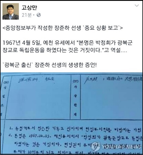 고 전 조사관은 ‘광복군 출신’ 장준하 선생이 1967년 4월5일 대통령 선거 당시, 윤보선 야당 후보 지지 예천 유세중 “박정희가 광복군 장교로 독립 운동을 하였다는 것은 거짓이다. 그는 만주지역에서 일본군으로 근무했다”고 생생하게 증언했다고 전했다.