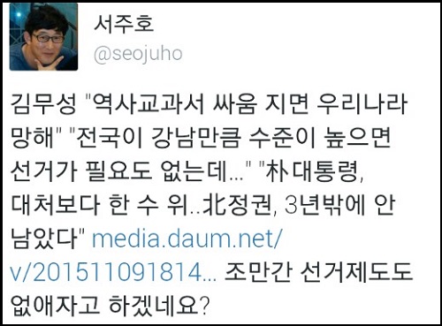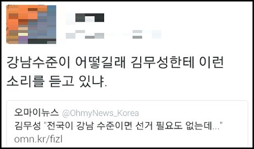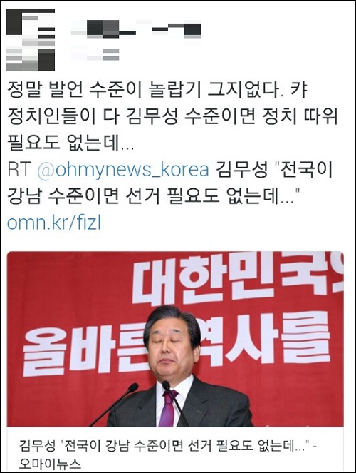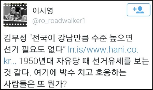 김무성 새누리당 대표의 ‘강남예찬성’ 발언이 또 구설수에 올랐다. 9일 서울 강남구민회관에서 열린 율곡포럼 특강에서 “전국이 강남만큼 수준 높으면 선거 필요도 없다”고 발언한 것. 해당 발언을 접한 네티즌들은 ‘지역비하 발언’이라는 등 비난을 쏟아냈다.