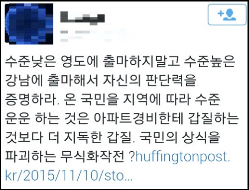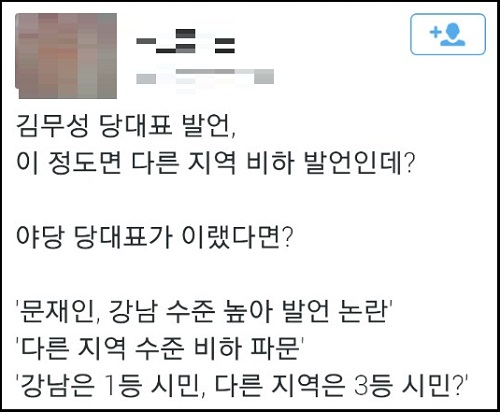 해당 발언을 접한 수도권의 한 의원은 <뉴시스>에 “아무리 강남 가서 립서비스를 했다고 해도 정도가 지나치다”며 “강남 빼고 전국 전 지역이 기분 나빠 할 저런 발언을 왜 하는지 모르겠다”고 비판했다.