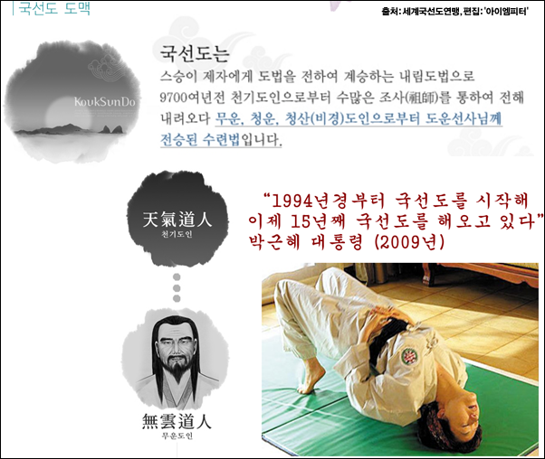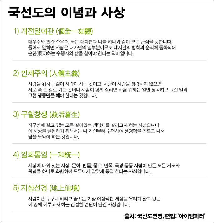 국선도 이념에는 '일화통일'이라는 말이 있습니다. 세상에 나와 있는 사상, 문화, 법률, 종교, 민족,국경 등등 사람이 만든 모든 제도와 관념을 화합하여 모두에게 알맞게 통일한다는 사상입니다. 박근혜 대통령이 국선도의 일화통일을 국정 이념의 기준이나 목표로 제발 삼지 않기만을 바랄 뿐입니다.