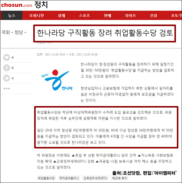 박근혜 대통령은 2011년 한나라당 비상대책위원장 시절에 '취업활동수당' 도입을 수차례 강조했습니다. 박근혜 대통령의 지시를 받은 한나라당은 청.장년의 구직활동을 위해 월 30~50만 원의 '취업활동 수당'을 지급하는 방안을 마련하기도 했습니다.