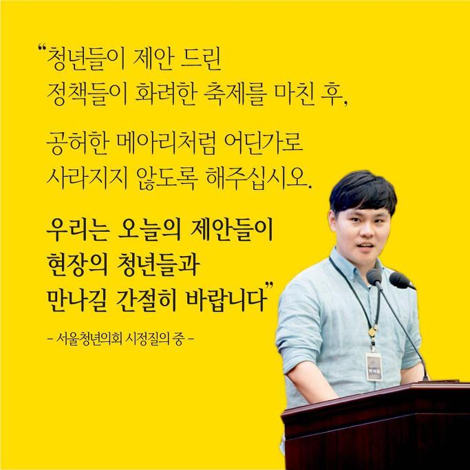 정책을 비판할 수 있습니다. 그러나 최소한 자신들이 내놓은 정책과 똑같은 정책을 내놓은 박원순 시장을 비난하는 일은 말이 되지 않습니다. 박원순 시장의 '청년수당' 정책을 포퓰리즘이라고 비난하는 모습은 민생을 그토록 외치고 있는 박근혜 정권이 해야 할 행동은 결코 아닙니다.