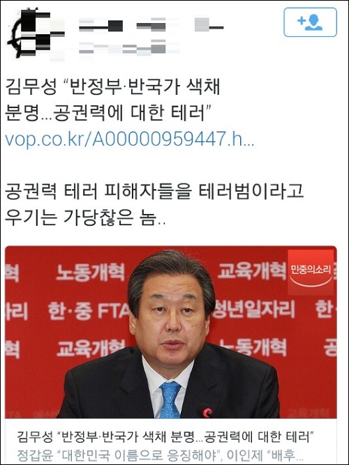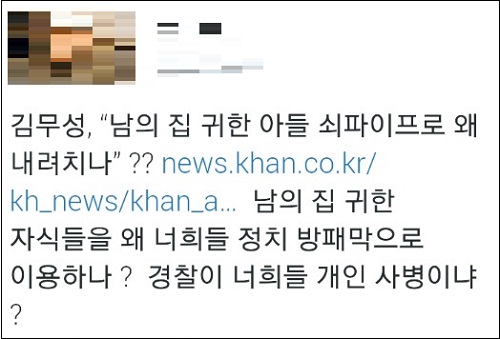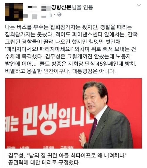 농민 백남기 씨가 경찰이 쏜 직격 물대포에 맞아 현재 생명이 위독한 가운데 새누리당 김무성 대표가 ‘시위대가 남의 집 귀한 아들을 죽을 힘을 다해 쇠파이프로 내려쳤다’는 발언을 해 물의를 빚고 있다.