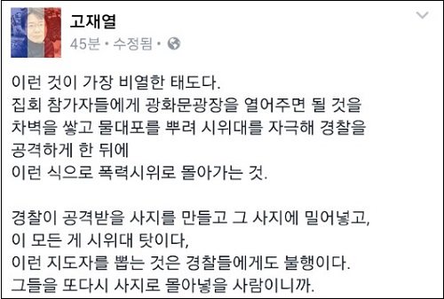 또 <시사인> 고재열 기자는 “이런 것이 가장 비열한 태도”라면서 “집회 참가자들에게 광화문광장을 열어주면 될 것을 차벽을 쌓고 물대포를 뿌려 시위대를 자극해 경찰을 공격하게 한 뒤에 이런 식으로 폭력시위로 몰아가는 것”이라고 꼬집었다.
