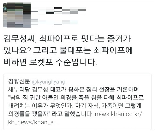 김 대표의 이 같은 발언에 대해 상지대 홍성태 교수는 이날 자신의 페이스북을 통해 “남의 집 귀한 아버지를 물대포로 왜 죽이나? 남의 집 귀한 아들 팔을 물대포로 왜 부러트리나?”라면서 “사악하고 사악하고 사악한 것들”이라고 강하게 비판했다.