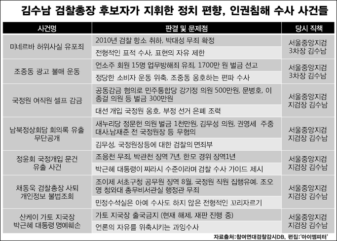 11월 19일 국회 법제사법위원회는 김수남 검찰총장 후보자에 대한 인사청문회를 실시합니다. 김수남 검찰총장 후보자 인사청문회의 가장 큰 쟁점은 그가 지휘했던 사건들에 대한 정치적 중립성입니다. 김수남 검찰총장 후보자가 지휘 선상에 있던 사건들을 보면 정치적으로 편향됐었고, 인권을 침해한 경우가 많았습니다.