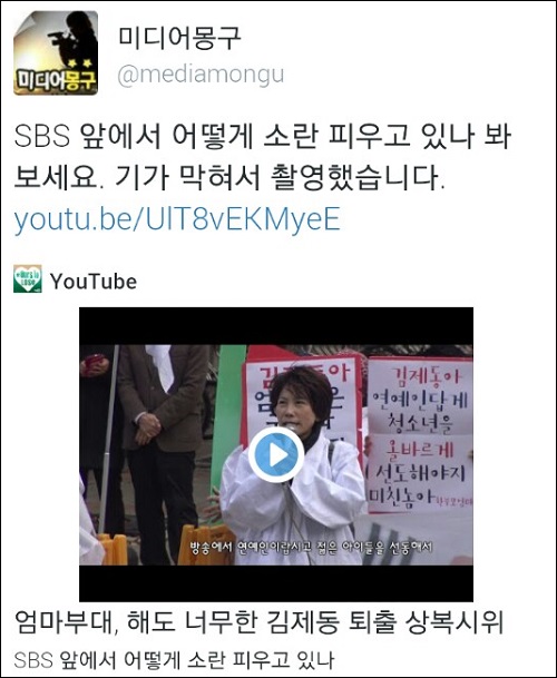 1인미디어 ‘미디어몽구’는 이들의 시위 모습이 담긴 영상을 자신의 블로그를 통해 공개, ‘영상으로 보면 해도 너무하다는 생각과 함께 이들의 수준을 판단할 수 있을 것”이라고 전했다.