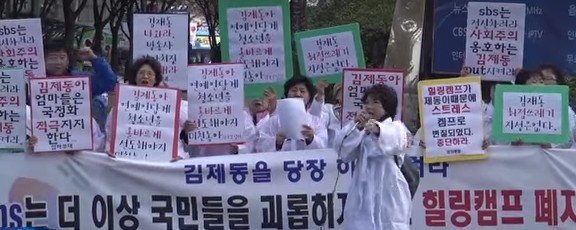 엄마부대봉사단, 탈북 엄마회 등 보수단체 회원들은 이날 “사회주의 옹호하는 김제동” “허접 쓰레기” 등 욕설들이 적힌 피켓을 들고 김씨의 방송 퇴출을 요구했다.