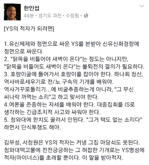 한인섭 교수는 26일 자신의 페이스북 “YS의 적자가 되려면”이란 제목의 글을 통해 “청와대 떡고물에 전전긍긍하는 그 허접한 기개로는 YS 명성에 적자(마이너스)를 초래할 뿐”이라며 이같이 직언했다.