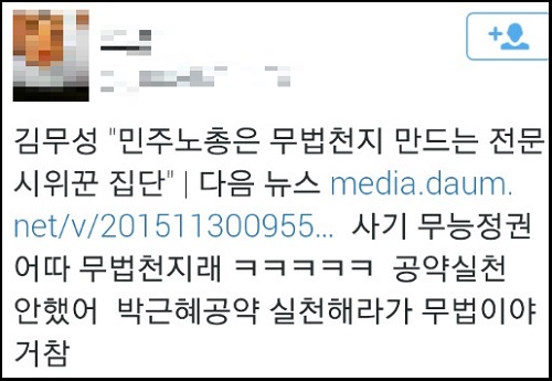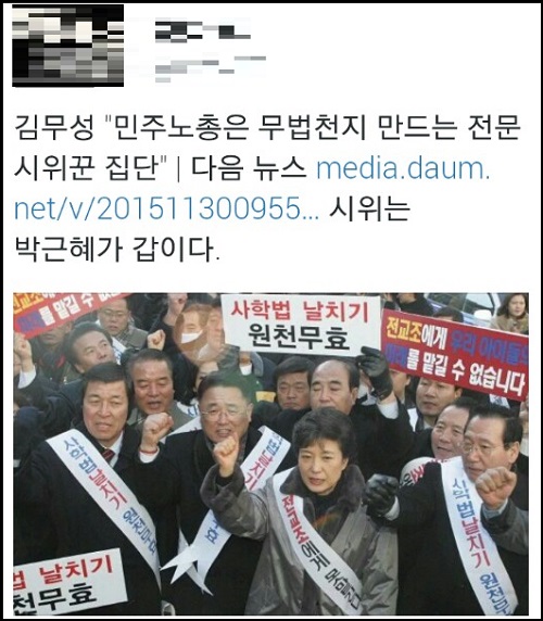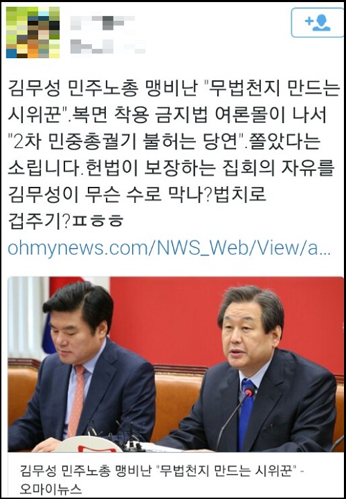 이밖에도 SNS상에서는 “사기 무능 정권 어따 무법천지래”, “김무성이는 국민이 두렵지 않나”, “헌법이 보장하는 집회의 자유를 김무성이 무슨 수로 막나”, “시위는 박근혜가 갑이다”는 등 비난 반응들이 잇따랐다.