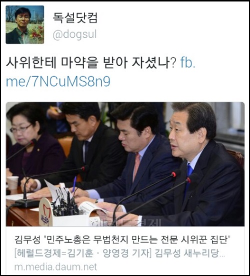 김 대표의 이 같은 주장에 <한겨레> 허재현 기자는 “새누리당 의원들이 법을 어겨왔던 것들 하나하나 살펴볼까요?”라면서 “어느 집단이 진짜 무법천지인지는 금방 드러난다”고 꼬집었다.