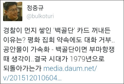정중규 대구대학교 한국재활정보연구소 부소장은 트위터를 통해 “백골단이면 부마항쟁 때 생각이.. 결국 시대가 1979년으로 되돌아가는가”라고 개탄했다.