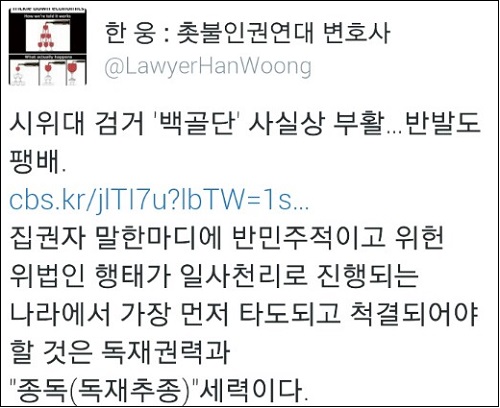 그런가하면 촛불인권연대 한웅 변호사는 “집권자 말 한마디에 반민주적이고 위헌․ 위법인 행태가 일사천리로 진행되는 나라에서 가장 먼저 타도되고 척결되어야 할 것은 독재권력과 ‘종독(독재추종)’ 세력이다”고 일갈했다.