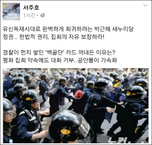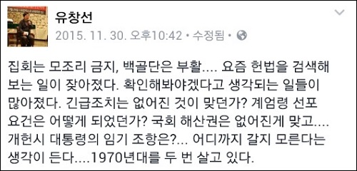 유창선 시사평론가는 페이스북에 “집회는 모조리 금지. 백골단은 부활... 요즘 헌법을 검색해 보는 일이 잦아졌다”면서 “어디까지 갈지 모른다는 생각이 든다.. 1970년대를 두 번 살고 있다”고 통탄했다.