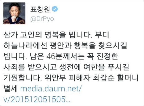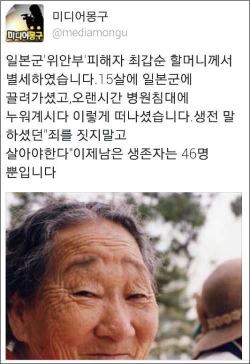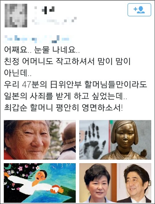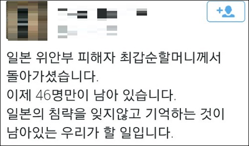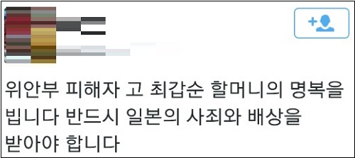 온라인상에서도 최갑순 할머니의 영면을 기원하는 메시지와 함께 ‘위안부’ 문제 해결을 촉구하는 목소리가 더해지고 있다.