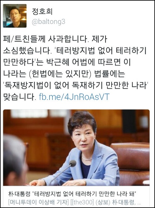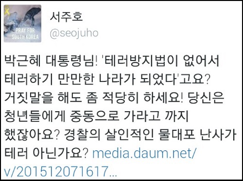 박 대통령의 ‘테러하기 만만한 나라’ 발언을 두고 네티즌 ‘이**’은 “누가 보면, 미국이나 프랑스는 테러방지법이 없기 때문에 테러가 발생한 것으로 생각하겠다”고 일갈했다.