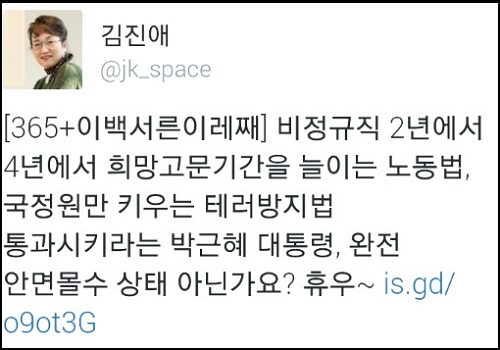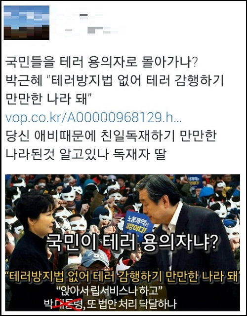 이밖에도 “이젠 5.16쿠데타가 아니라 5.16테러라고 해야겠구나”, “부정선거하기도 만만한 나라지. 대통령이 7시간 실종하기 만만하고, 국민들 상대로 폭력행사하기도 만만한 나라지”, “국민안전처가 없어서 세월호가 가라앉고 메르스가 터졌냐?”, “진짜 대책이 없다”, “독재자 방지법이 없어 독재하기 좋은나라!”, “테러방지법이라 말하고 유신헌법이라고 쓴다”, “테러법이냐? 독재법이냐?”라는 등 비난이 잇따랐다.