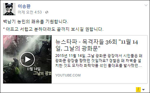 백남기씨와 관련 이승환씨는 9일 페이스북에 뉴스타파의 ‘목격자들 36회 “11월 14일, 그날의 광화문”’ 영상을 공유하며 “백남기 농민의 쾌유를 기원합니다”라고 썼다. 그는 “아프고 서럽고 분하더라도 끝까지 보시길 권한다”고 해당 영상을 추천했다.