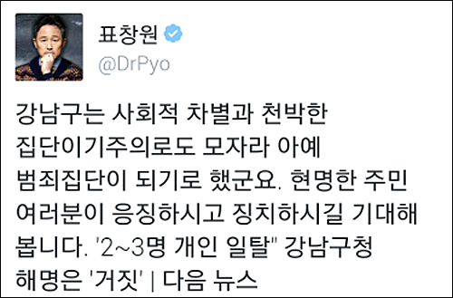 지난 대선 당시 ‘국정원 댓글 사건’을 “중대한 범죄행위”라며 강력 비난했던 표창원 범죄과학연구소 소장은 11일 “강남구는 사회적 차별과 천박한 집단이기주의로도 모자라 아예 범죄집단이 되기로 했군요”라며 “현명한 주민 여러분이 응징하시고 징치하시길 기대해 본다”라고 ‘응징’을 촉구했다.