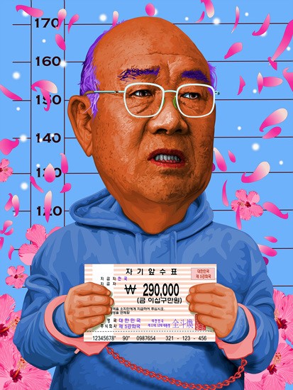이하 작가 트유의 그림체로 그려진 포스터에서 전 전 대통령은 푸른색 수의를 입고 수갑을 착용한 채 손에 29만원짜리 수표를 들고 있다.