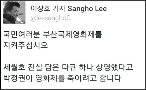 부산시의 이번 고발조치에 대해 <다이빙벨> 이상호 감독은 트위터를 통해 “부산국제영화제를 지켜달라”면서 “세월호 진실 담은 다큐 하나 상영했다고 박정권이 영화제를 죽이려고 한다”고 개탄했다.