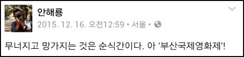 공동연출을 맡은 안해룡 감독도 “무너지고 망가지는 것은 순식간이다. 아 ‘부산국제영화제’!”라고 탄식했다.
