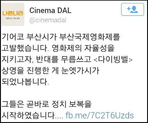 세월호 참사를 다룬 영화 <다이빙벨>과 <나쁜나라>의 배급을 맡고 있는 ‘시네마달’은 공식 트위터를 통해 “기어코 부산시가 부산국제영화제를 고발했다”면서 “영화제의 자율성을 지키고자, 반대를 무릅쓰고 <다이빙벨> 상영을 진행한 게 눈엣가시가 되었나보다”고 꼬집었다.