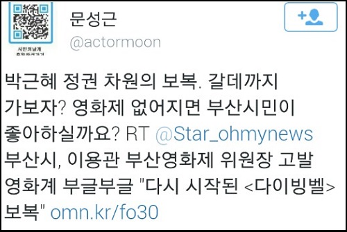 그런가하면 배우 문성근 씨는 이 같은 소식에 “박근혜정권 차원의 보복. 갈데까지 가보자?”라면서 “영화제 없어지면 부산시민이 좋아하실까요?”라고 질타했다.