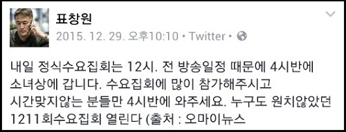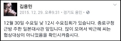 ‘위안부’ 협상 ‘졸속’ 타결로 후폭풍이 거센 가운데 온라인상에서는 이날 수요집회에 함께하자는 목소리도 나왔다.