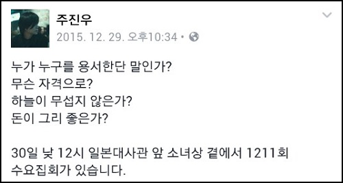 <시사인> 주진우 기자도 “누가 누구를 용서한단 말인가? 무슨 자격으로? 하늘이 무섭지 않은가? 돈이 그리 좋은가”라고 꼬집으며 수요집회 일정을 공유했다.