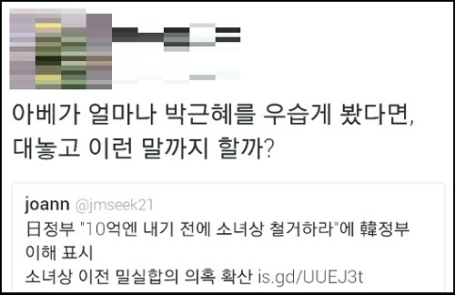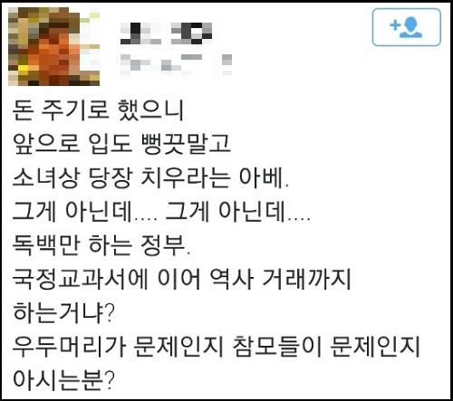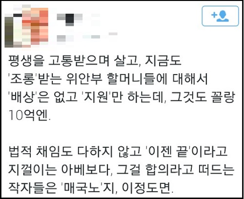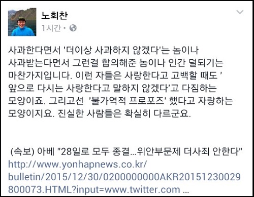 일본 언론을 통해 이 같은 소식이 전해지자 노회찬 전 정의당 대표는 페이스북을 통해 “사과한다면서 ‘더 이상 사과하지 않겠다’는 놈이나 사과 받는다면서 그런 걸 합의해준 놈이나 인간이 덜 되기는 마찬가지”라고 꼬집었다.