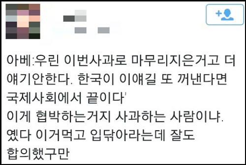 그러면서 아베 총리는 “이렇게까지 한 이상 약속을 어기면 한국은 국제사회의 일원으로서 끝난다”는 견해를 밝혔다고 <산케이>는 전했다.