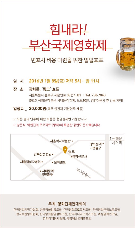 한편, 영화계 10개 단체로 꾸려진 영화단체연대회의는 다음달 8일 서울 광화문에 있는 링크 호프(종로구 새문안로 38번지 지하 1층)에서 ‘부산국제영화제 변호사 비용 마련을 위한 일일 호프’를 연다고 29일 밝혔다.