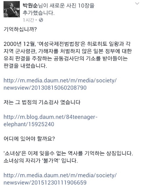 박 시장은 30일 자신의 페이스북을 통해 이 같이 밝히며 지난 2000년 12월 8일에 열린 ‘여성 국제전범 법정’을 상기, “저는 그 법정의 기소검사 였다”고 밝혔다.