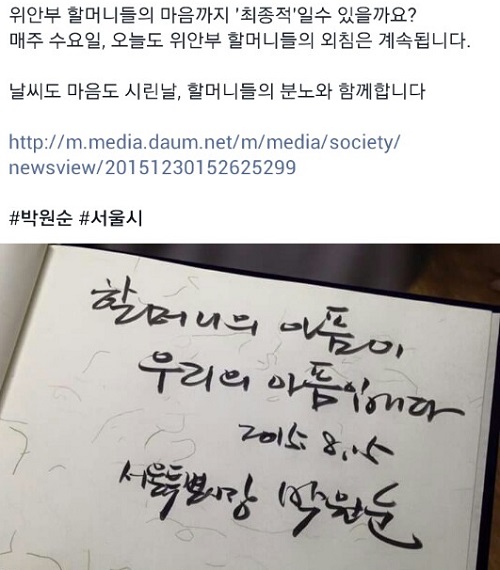 박 시장은 해당글 말미에 “위안부 할머니들의 마음까지 ‘최종적’ 일 수 있을까요?”라고 반문하며 “매주 수요일, 오늘도 위안부 할머니들의 외침은 계속됩니다. 날씨도 마음도 시린날, 할머니들의 분노와 함께 한다”고 전했다.