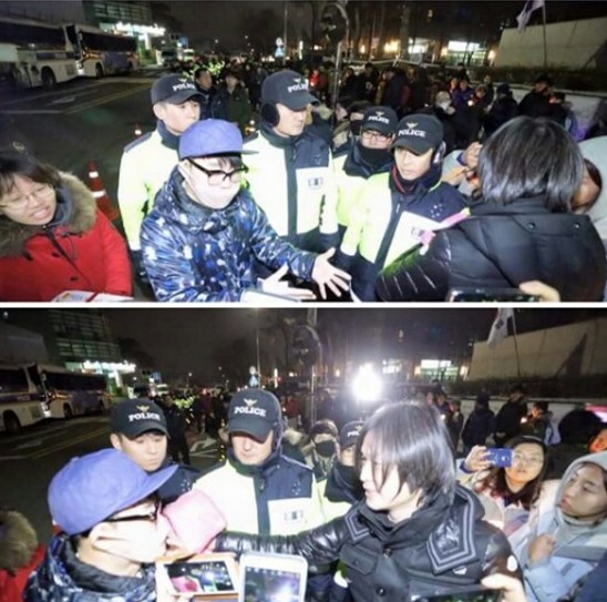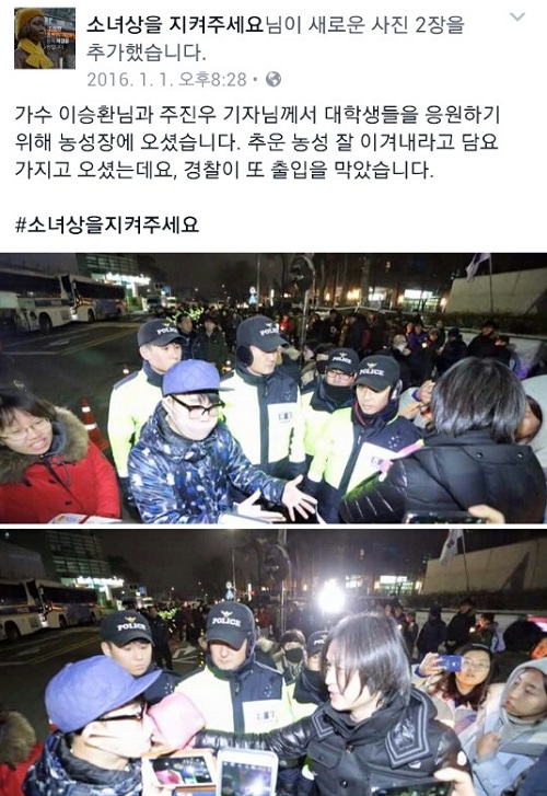 지난 1일에는 가수 이승환 씨와 <시사인> 주진우 기자도 농성장을 찾았다. 이들은 추위 속에서 농성을 벌이고 있는 학생들을 위해 담요 등을 전달하려 했으나 경찰이 이들의 출입을 막아 항의를 받기도 했다.