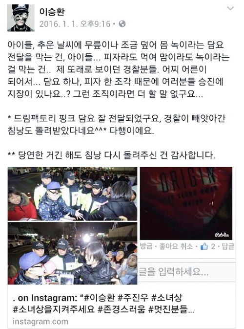 이승환 씨는 이날 오후 이같은 소식을 전하면서 “담요 하나, 피자 한 조각 때문에 여러분들 승진에 지장이 있냐”면서 “그런 조직이라면 더 할 말 없다”고 질타했다.