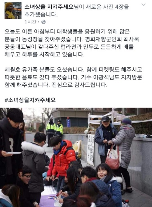 ‘평화의 소녀상’을 지키기 위한 시민들의 발걸음은 계속되고 있다. 위안부 문제 관련 활동을 알리는 페이스북 페이지 ‘소녀상을 지켜주세요’에는 시민들의 방문 소식이 실시간 업데이트 되고 있다.