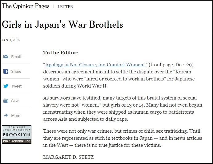 미국의 여성학 교수가 뉴욕타임즈(NYT)의 한일 ‘위안부’ 협상 보도와 관련 “일본이 끌고간 것은 성인들이 아니라 13~14세의 소녀들이었다”고오류를 지적하고 나섰다.
