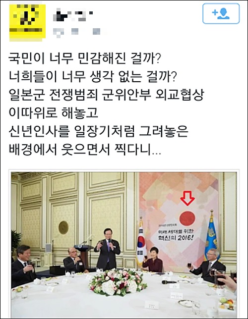 특히 박 대통령이 앉은 자리 뒤에 ‘2016년 신년인사회 미래세대를 위한 혁신의 2016!’이라는 글귀와 태양을 상징하는 붉은 원이 그려진 대형 현수막이 내걸려 논란이 되고 있다. 커다란 붉은 원이 언뜻 일본의 국기인 일장기를 연상시키기 때문이다.