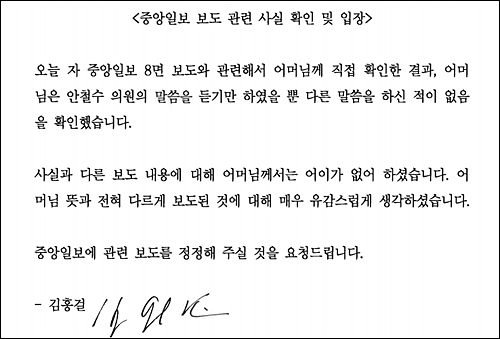 DJ의 3남 김홍걸 박사는 이날 입장문을 내고 “오늘 자 중앙일보 8면 보도와 관련해서 어머님께서 직접 확인한 결과, 어머님은 안철수 의원의 말씀을 듣기만 하였을 뿐 다른 말씀을 하신 적이 없음을 확인했다”고 밝혔다.
