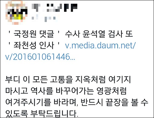 국가정보원의 대선 개입 댓글 사건 수사를 지휘했던 윤석열 대구고검 검사가 또 ‘좌천성 인사’를 당해 논란이 되고 있다. 네티즌들은 “국민들이 알아줄 겁니다”라며 응원 글을 올렸다.