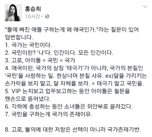 홍씨는 또 다른 글에서 자신이 들고 있던 팻말에 적힌 문구와 관련, “‘물에 빠진 애들 구하는 게 왜 애국인가’라는 질문이 있어 답변한다”면서 “애국이란, 국가의 상징 ‘태극기’가 아니라, 국가의 본질인 ‘국민’을 사랑하는 일”이라고 밝혔다.