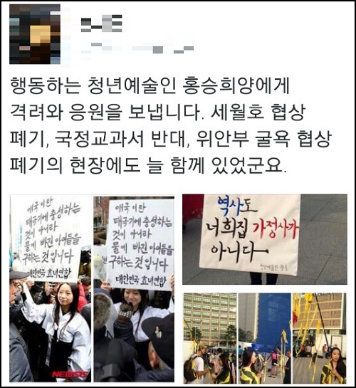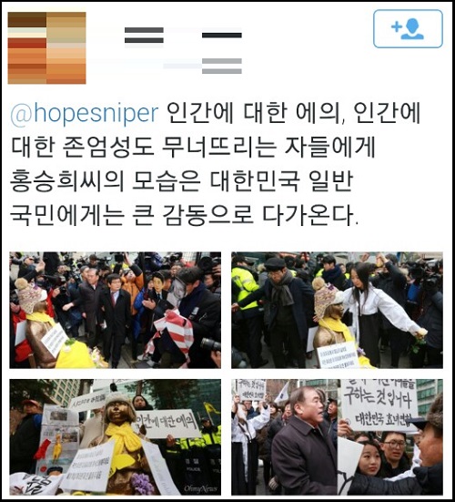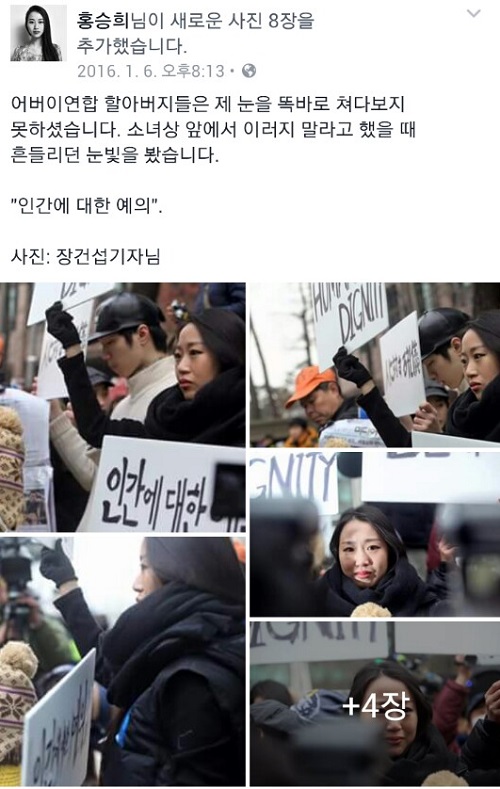 수요집회 이후 홍씨는 자신의 페이스북을 통해 “어버이연합 할아버지들은 제 눈을 똑바로 쳐다보지 못하셨다”며 “소녀상 앞에서 이러지 말라고 했을 때 흔들리던 눈빛을 봤다”고 당시 상황을 전했다.