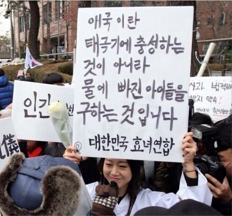 이들 손에는 “애국이란 태극기에 충성하는 것이 아니라 물에 빠진 아이들을 구하는 것입니다”, “역사는 거래할 수 없습니다. 불법 한일밀약 중단하세요” 등의 문구가 적힌 피켓이 들려 있었다.
