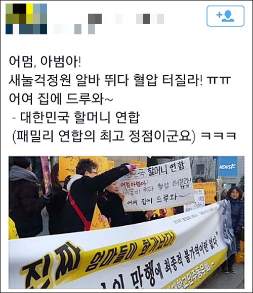 7일에는 평화어머니회와 이화여대 민주동문회 회원들이 “진짜 엄마들이 화났다”며 서울 중학동 옛 주한일본대사관앞에서 기자회견을 했다. 50대 이상이 주축으로 이들은 “대한민국할머니연합, 어멈, 아범아 알바 뛰다 혈압 터질라, 어여 집에 드루와”라고 적힌 피켓을 들고 시위를 벌였다.
